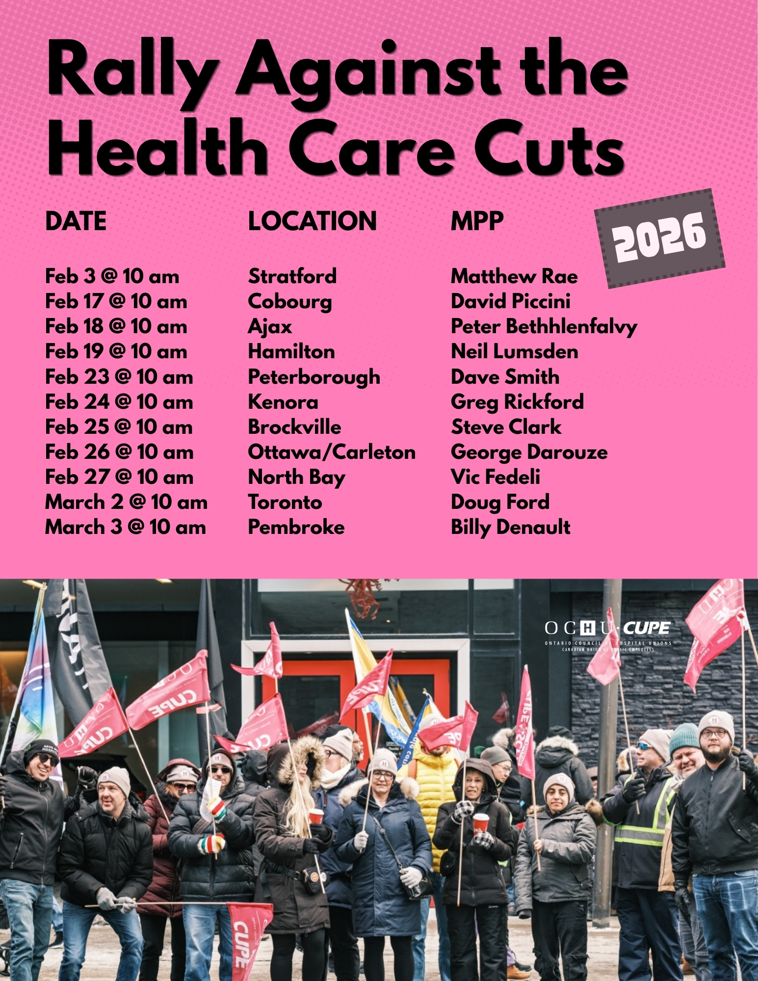 Rally Against the Health Care Cuts by OCHU | Jan 8, 2026 | Anti-Privatization, Events FOR IMMEDIATE RELEASE January 8, 2026 Rally Against the Health Care Cuts ← Previous Other Articles North Bay hospital workers’ union to hold public town hall on Tuesday, December 2 Dec 2, 2025 | Media Releasesread more “A setback for access to health care in North Bay:” CUPE blames Ontario government’s underfunding for staff cuts at local hospital Oct 27, 2025 | Media Releasesread more Nurse-to-patient ratios save lives and reduce staff burnout, says new academic study Aug 19, 2025 | Media Releasesread more Nurse-to-patient ratios save lives and reduce staff burnout, says new academic study Aug 19, 2025 | Media Releasesread more Nurse-to-patient ratios save lives and reduce staff burnout, says new academic study Aug 19, 2025 | Media Releasesread more “Nursing ratios save lives:” new study recommends Ontario government mandate safe nurse staffing levels in hospitals Aug 17, 2025 | Media Releasesread more « Older Entries
