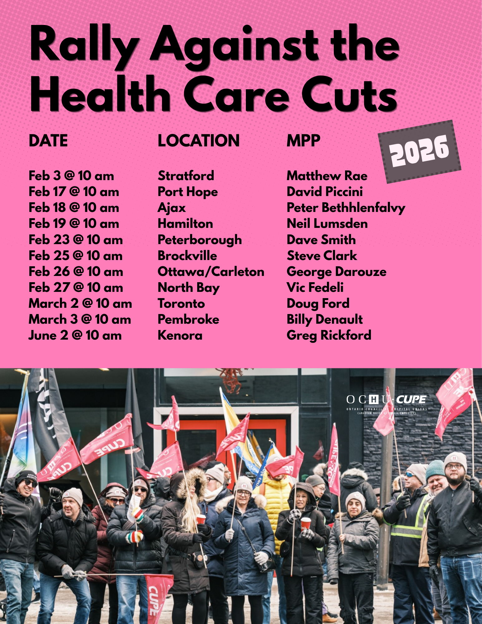 2026 MPP Rallies by OCHU | Feb 11, 2026 | Hospital Cuts FOR IMMEDIATE RELEASE February 11, 2026 2026 MPP Rallies Attend the MPP rallies to stand against the healthcare cuts! ← Previous Next → Other Articles Health care workers to protest outside MPP George Darouze’s office on Thursday as funding cuts take toll on staff, patients Feb 24, 2026 | Hospital Cuts, Media Releasesread more Health care workers protest outside MPP Dave Smith’s office as funding cuts take toll on staff, patients Feb 24, 2026 | Hospital Cuts, Media Releasesread more Health care workers protest outside MPP Neil Lumsden’s office as funding cuts take toll on staff, patients Feb 19, 2026 | Media Releasesread more New report warns of more job cuts, longer wait-times and declining quality of care in Niagara as funding cuts squeeze Ontario hospitals Feb 9, 2026 | Hospital Cuts, Media Releasesread more New report warns of longer wait-times, rushed care, and overcrowded Ontario hospitals as government cuts expected to cause over 10,000 job losses and shortfall of 4,080 beds Jan 28, 2026 | Hospital Cuts, Media Releasesread more New report warns of longer wait-times, rushed care, and overcrowded Ontario hospitals as government cuts expected to cause over 10,000 job losses and shortfall of 4,080 beds Jan 28, 2026 | Hospital Cuts, Media Releasesread more « Older Entries
