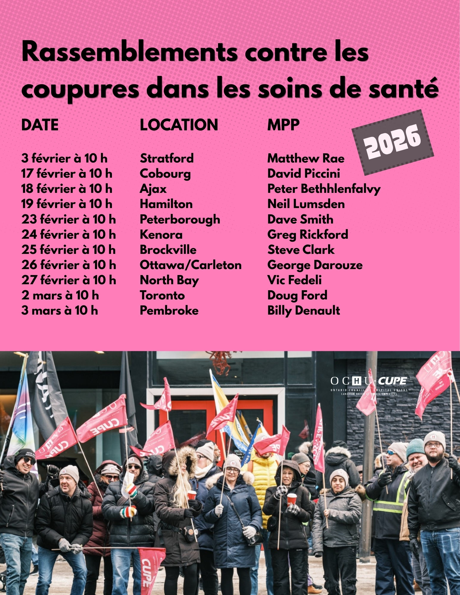 Rassemblements contre les coupures dans les soins de santé par OCHU | Jan 8, 2026 | Anti-Privatization, Events pour diffusion immédiate janvier 8, 2026 Rassemblements contre les coupures dans les soins de santé ← Précédent Other Articles 9,2 milliards en 10 ans pour les services privés dans les hôpitaux ontariens Mai 28, 2025 | Media Releases, Newslire plus Les travailleur(-euse)s d’hôpitaux protestent contre les suppressions d’emplois et le chaos dans le réseau Lakeridge Health Mar 21, 2024 | Media Releaseslire plus Les salaires des femmes et l’attaque contre les travailleur(-euse)s du secteur public élargi. Fév 29, 2024 | Media Releaseslire plus Selon un nouveau sondage, 88 % des travailleur(-euse)s des hôpitaux du nord de l’Ontario n’ont pas confiance envers le plan du gouvernement Ford pour le secteur de la santé, 49 % envisageant de partir. Fév 24, 2024 | Media Releaseslire plus Rassemblement aux portes du centre Perley : le personnel de santé réclame de meilleures conditions de travail et de vie dans l’établissement de soins résidentiels Fév 21, 2024 | Media Releaseslire plus Déclaration sur la décision relative à la loi 124 Fév 12, 2024 | Media Releaseslire plus « Entrées précédentes