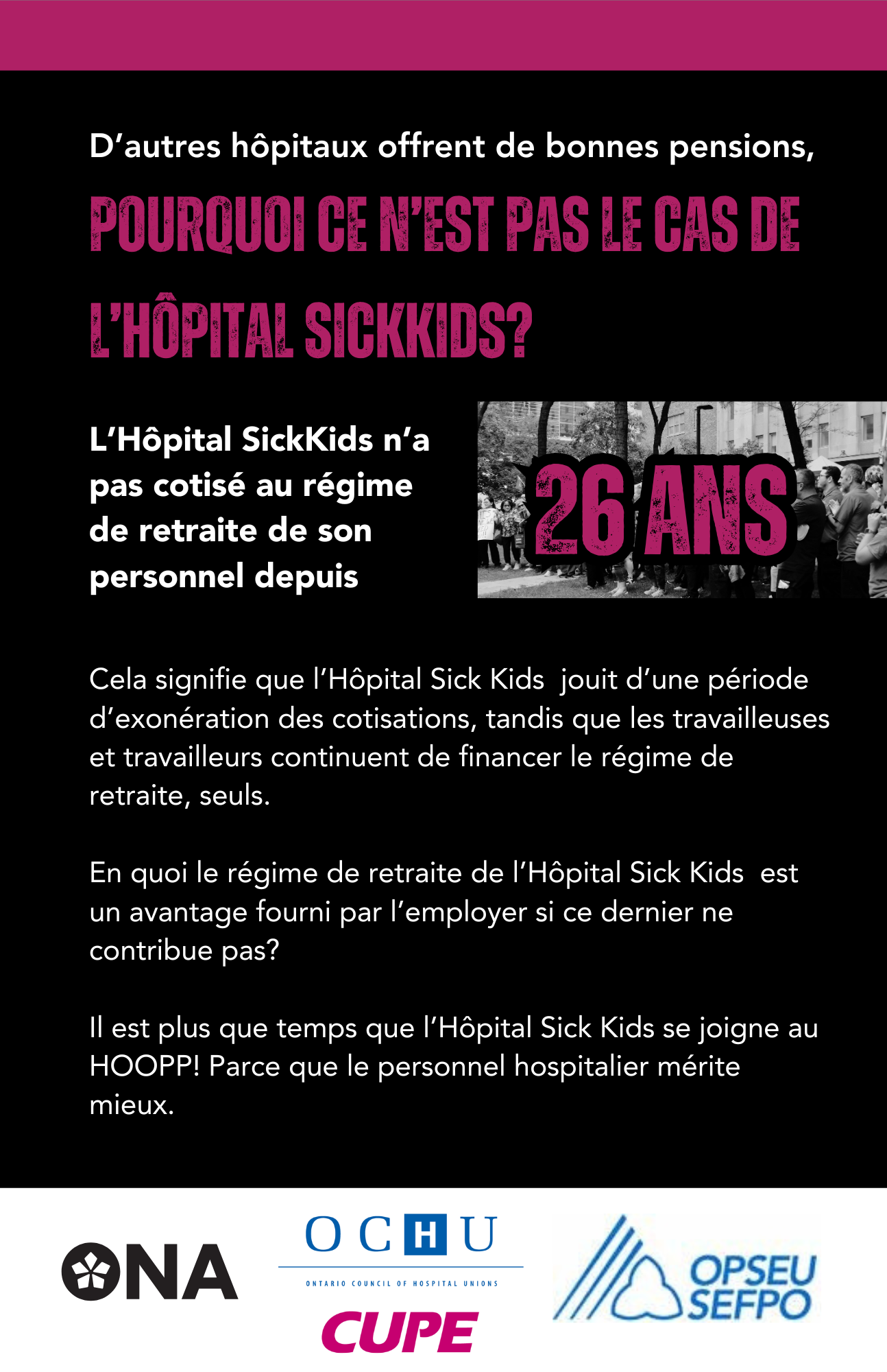Les travailleuses et travailleurs des soins de santé de l’Hôpital SickKids consacrent leur vie à offrir des soins extraordinaires dans des conditions difficiles. Leur refuser l’accès au régime de retraite n’est pas seulement injuste – c’est un refus de reconnaître leurs contributions essentielles. Une pension assurée n’est pas un luxe, c’est un droit fondamental qui assure que ces travailleuses et travailleurs puissent prendre leur retraite avec dignité. Il est temps pour l’Hôpital SickKids de faire la bonne chose et de participer au même régime de retraite que pratiquement tous les autres hôpitaux de l’Ontario.